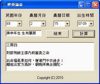 跟上週算八字很像的袁天罡秤骨術,突然想起之前用BCB有寫過,在農民曆的後面都會有。
